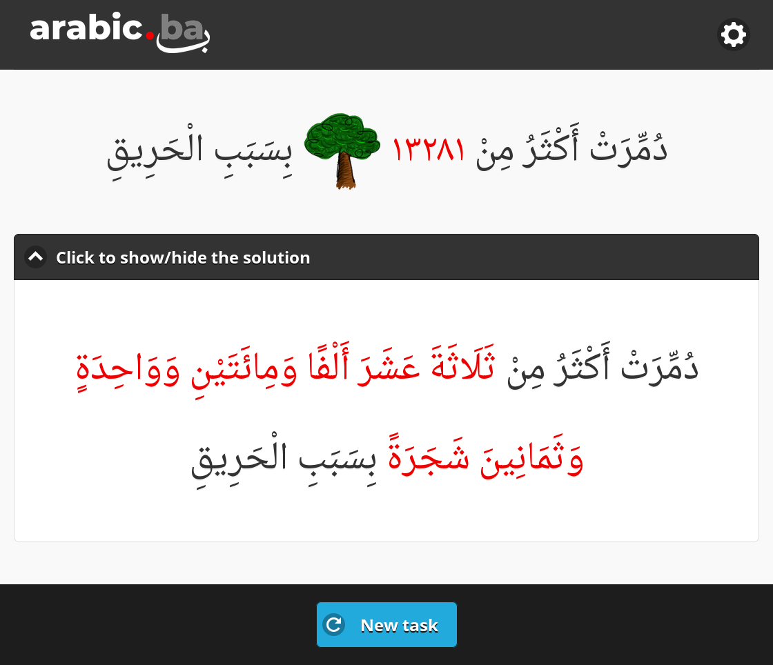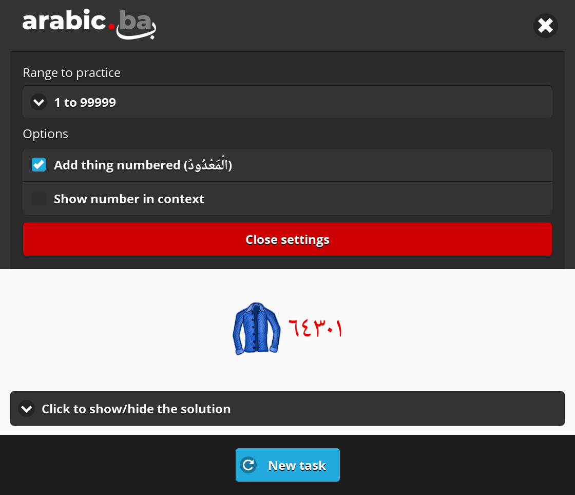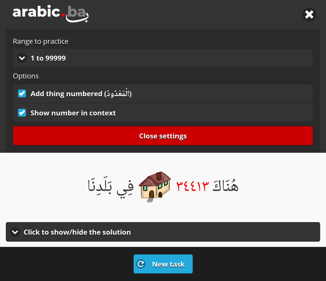 The most difficult type of exercise is the one enabled by setting the option Show number in context. With this option set, each task will display the number along with the thing being numbered in the context of a sentence. Depending on the role in which they appear in the sentence, they may take the nominative case (e.g. if they are the subject), the accusative case (e.g. if they are an object) or the genitive case (e.g. if they come after a preposition - حَرْفُ جَرٍّ).
