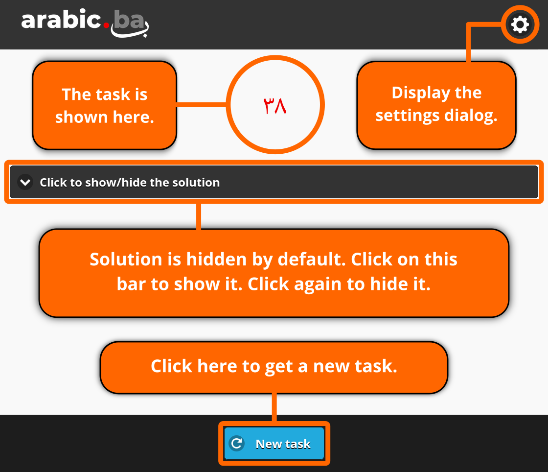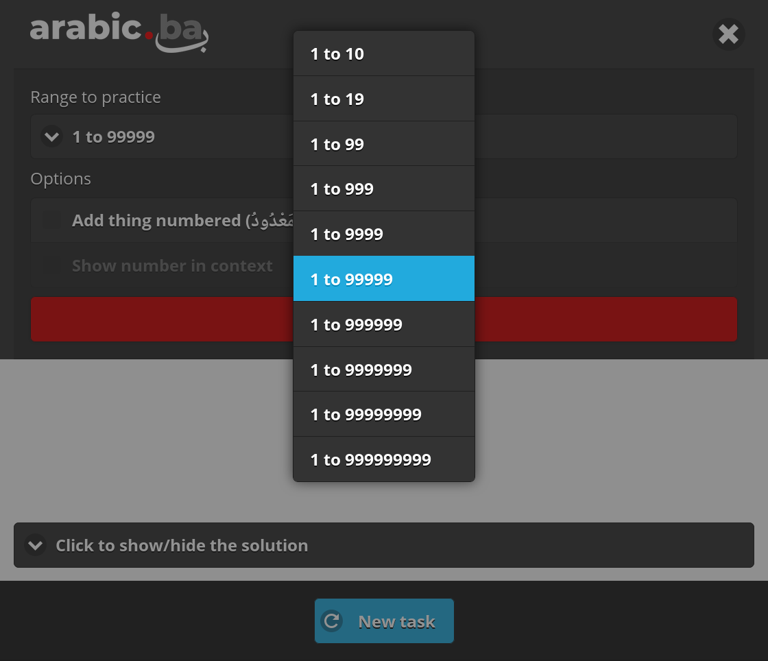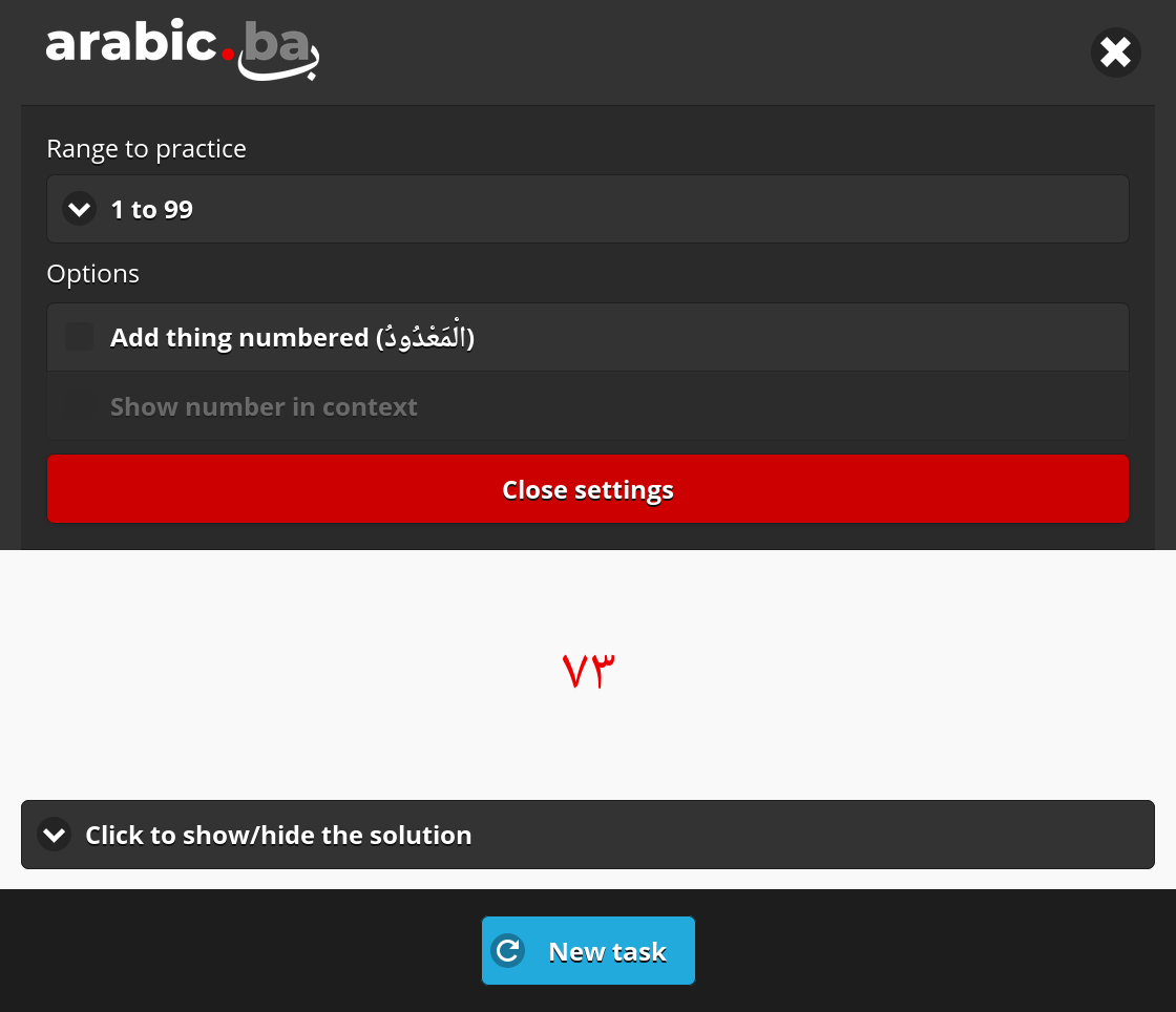 A drop-down list at the top allows you to choose the range of numbers to practice. The ranges offered on this list have been chosen carefully to correspond with the different rules pertaining to numbers in Arabic. Numbers from 1 to 10, for example, are governed by one set of rules, which are different from the rules affecting numbers 11 to 19. It is advisable to start with the first range (1 to 10), then progress slowly towards larger numbers.